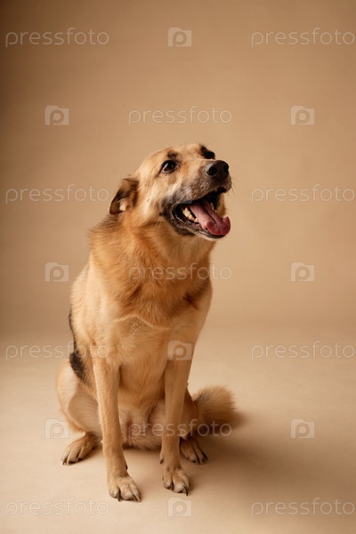 Сидящая немецкая овчарка выглядит счастливой и расслабленной