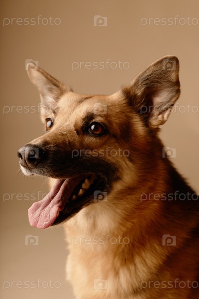 Счастливая собака, сидящая на бежевом фоне и улыбающаяся