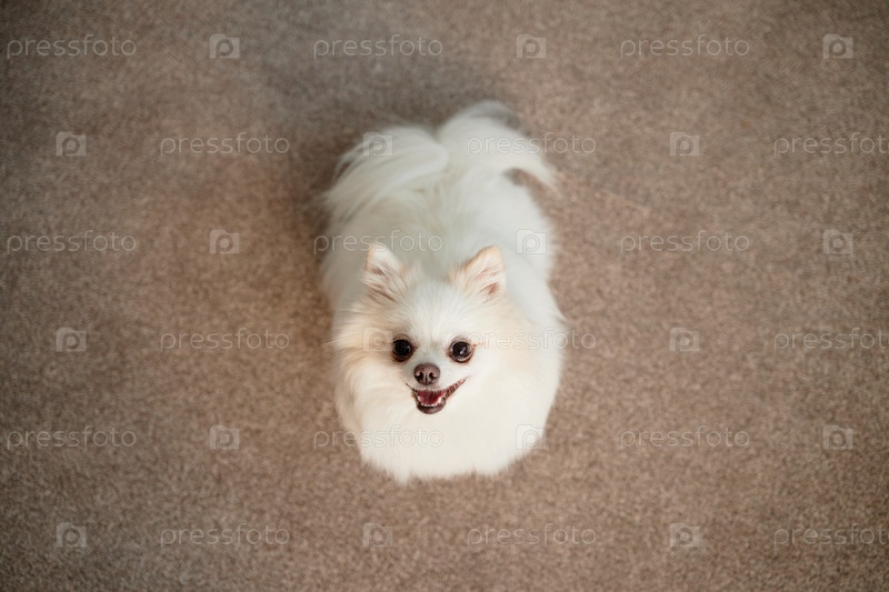 Улыбающийся Помераньян сидит на ковре Счастливо ждет угощения