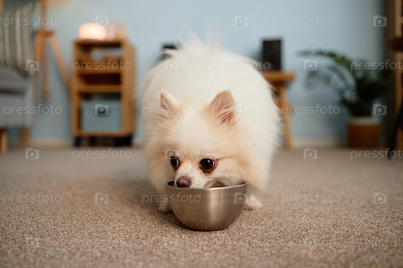 Пушистая белая собака ест из металлической миски Деревянный пол фоном