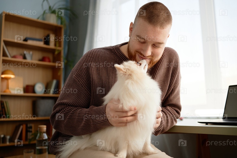 Улыбающийся мужчина ласкает пушистую белую кошку на коленях