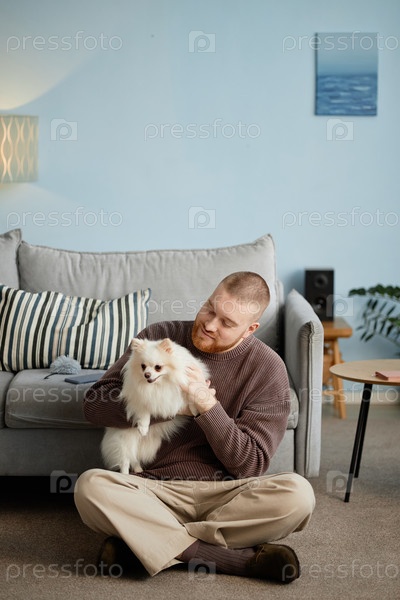 Улыбающийся мужчина держит пушистую белую собаку на диване