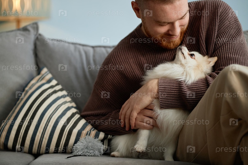 Улыбающийся мужчина сидит на диване и держит маленькую собаку