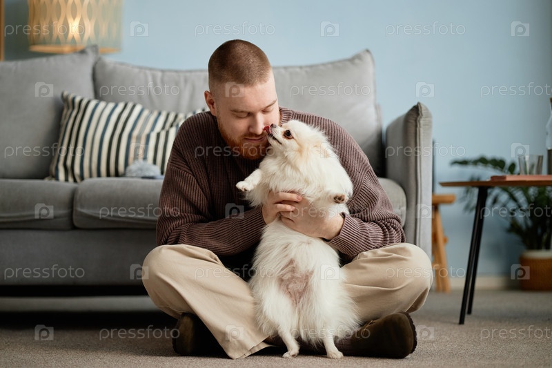 Сидящий на полу, обнимающий пушистого белого собачьего человека