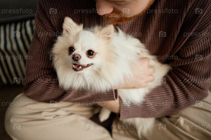 Обнимающий маленькую пушистую собаку в коричневом свитере