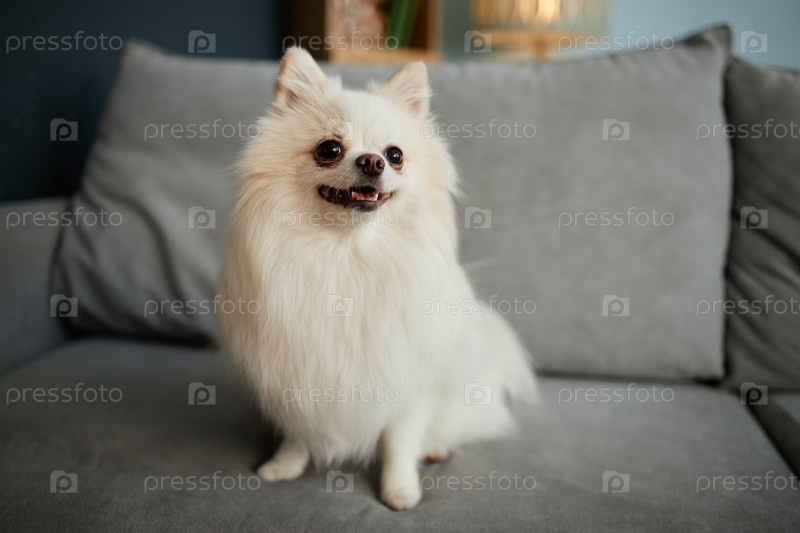 Очаровательный Белый Помераньян сидит на удобном диване