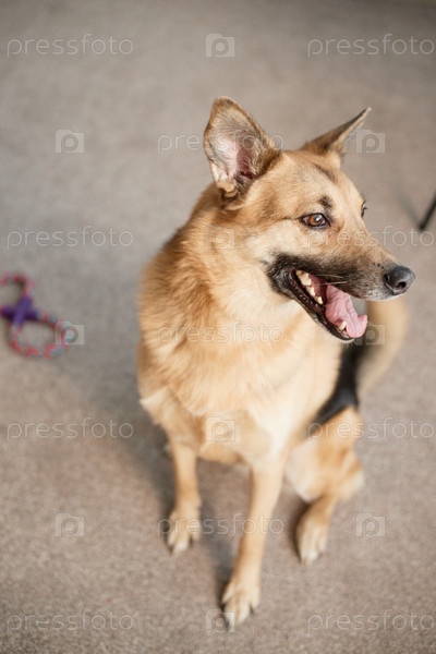 Немецкий овчарский микс сидит на полу с очерченной игрушкой