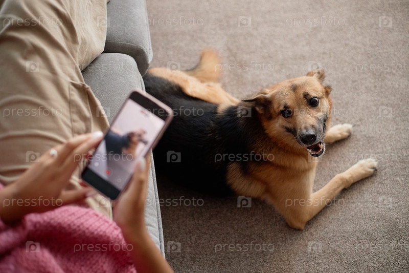 Сфотографировать собаку, лежащую на ковре рядом с диваном
