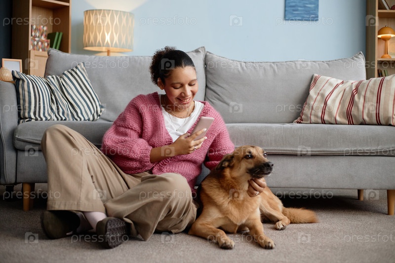 Улыбающаяся женщина сидит на диване с собакой и пользуется телефоном