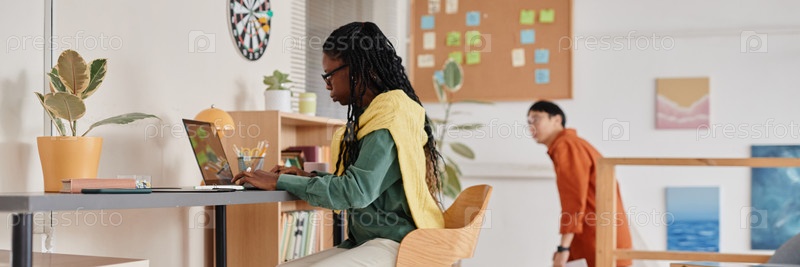 Работа в современном офисе с зелеными растениями и красочными декорациями