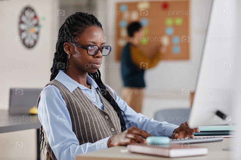 Сосредоточенная чернокожая женщина, работающая в современной офисной обстановке