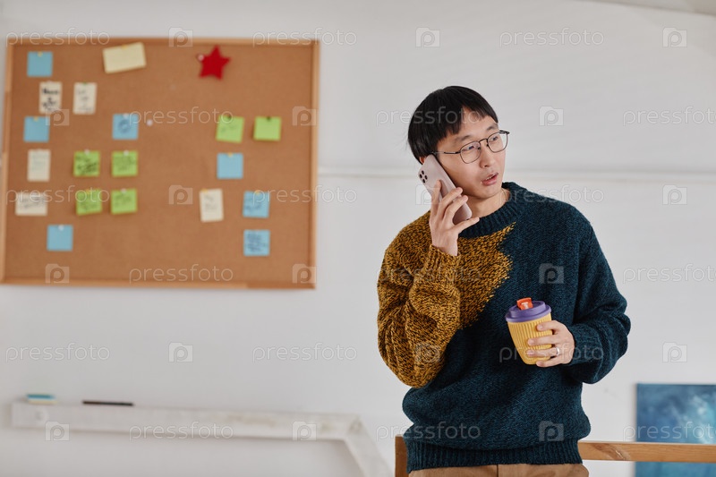 Азиатский мужчина разговаривает по телефону и пьет напитки