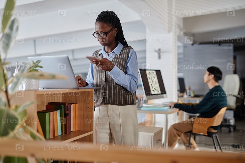 Сосредоточенный молодой профессионал, анализирующий данные о смартфонах