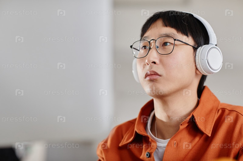 Портрет мужчины, носящего наушники и выглядящего сфокусированным