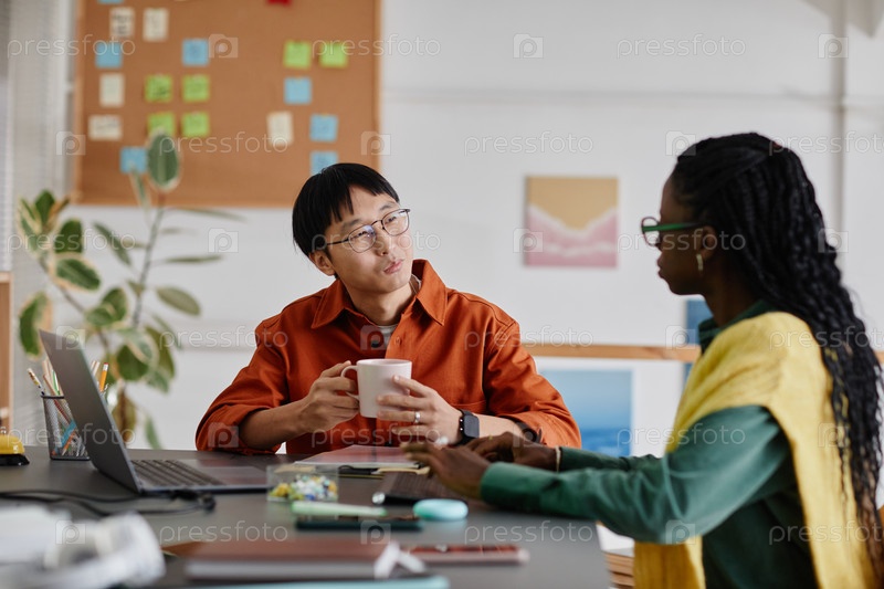 Разговор в современной офисной обстановке возле стола