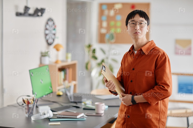 Портрет мужчины в очках, держащего клипборд в офисе