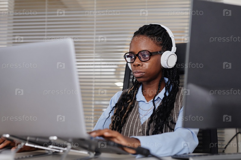 Портрет женщины, носящей наушники и работающей на компьютере