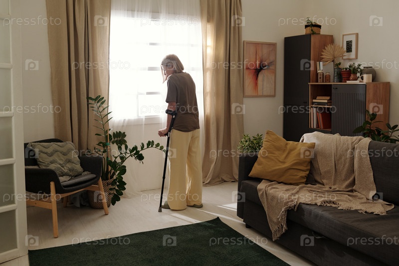 Пожилая женщина, стоящая возле окна, держит устройство помощи в ходьбе