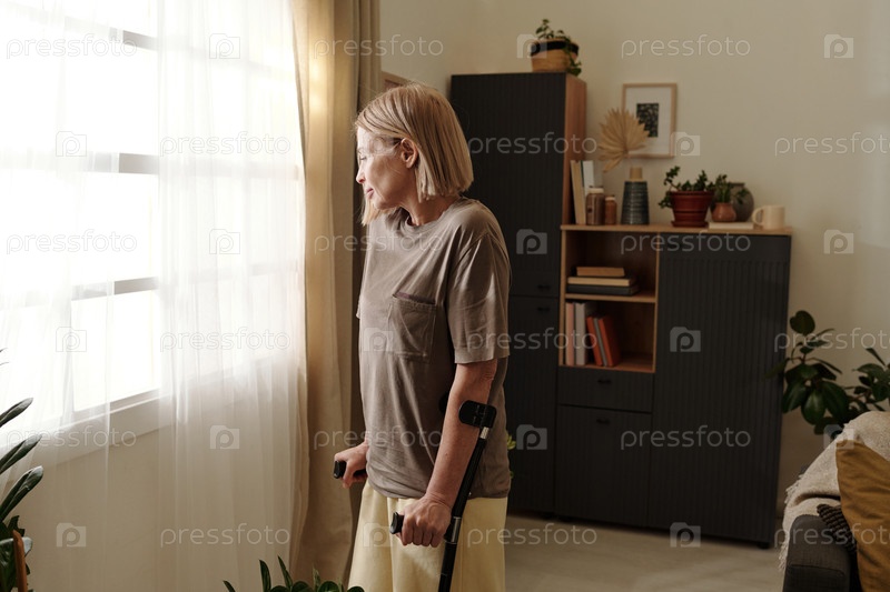 Пожилая женщина смотрит в окно с спокойным выражением лица