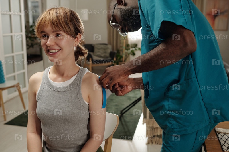 Улыбающаяся женщина получает прививку в клинике