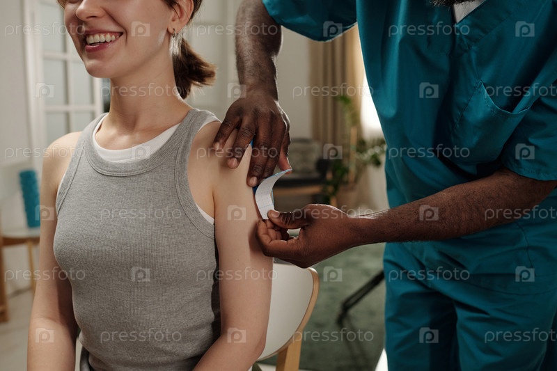Улыбающаяся женщина получает прививку от медицинского работника