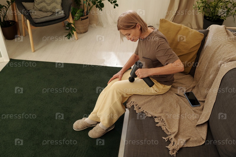 Пожилая женщина сидит на диване с горшковыми растениями на заднем плане