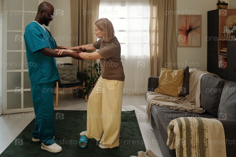 Заботливая медсестра помогает пожилому пациенту в гостиной