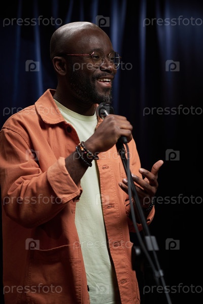 Улыбающийся мужчина, говорящий в микрофон под сценическими огнями