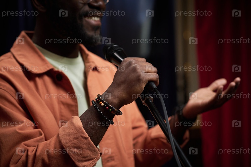 Улыбающийся чёрный человек, говорящий в микрофон