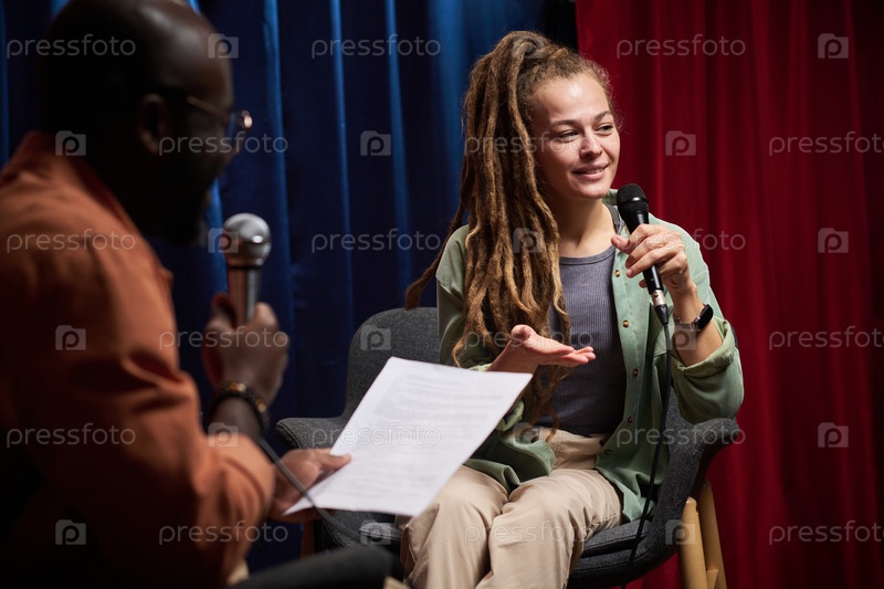 Интервью женщина сидит в кресле, держит микрофон улыбается