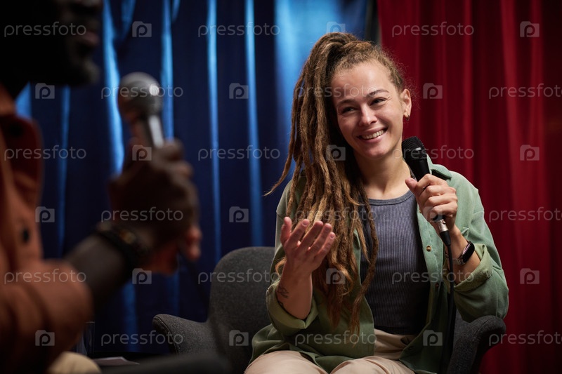 Улыбающаяся женщина держит микрофон во время сессии интервью