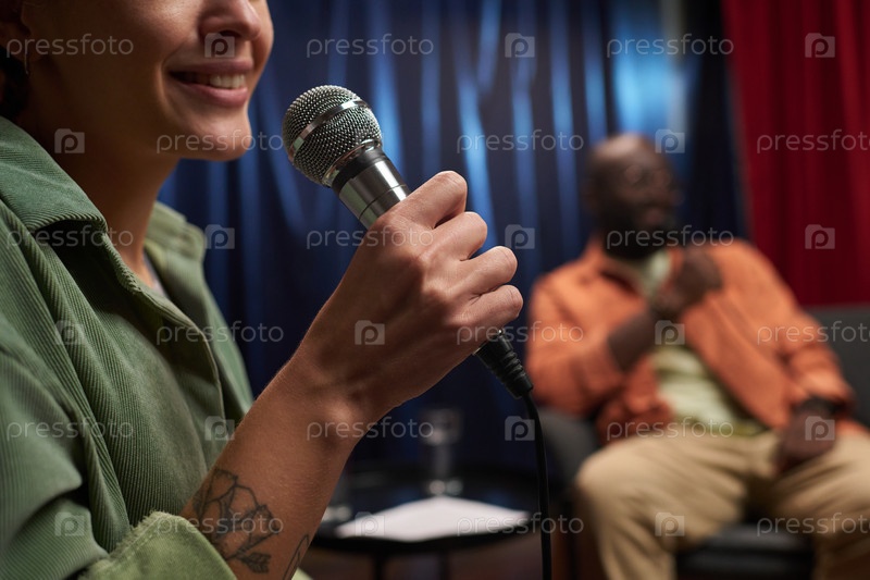 Улыбающаяся женщина держит микрофон во время дискуссионного мероприятия