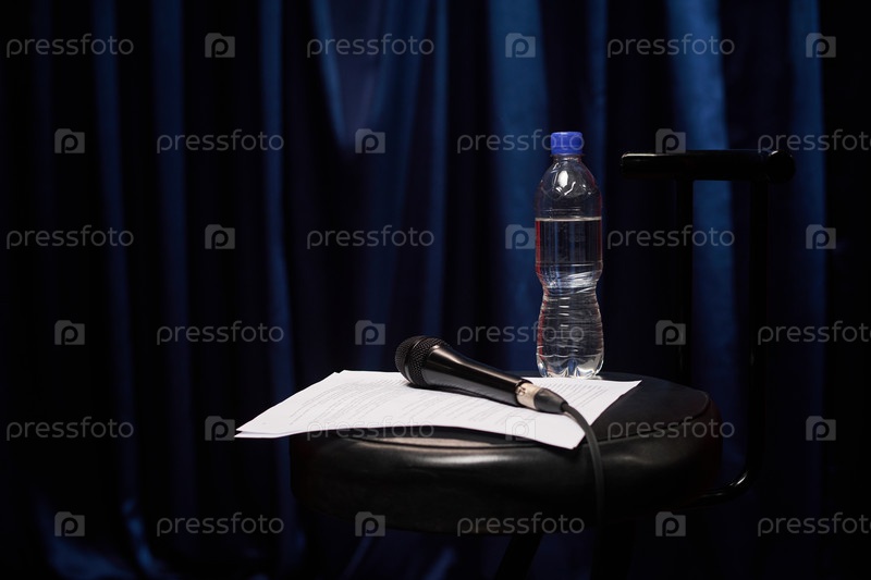 Микрофон и бутылка с водой на стуле с листом бумаги