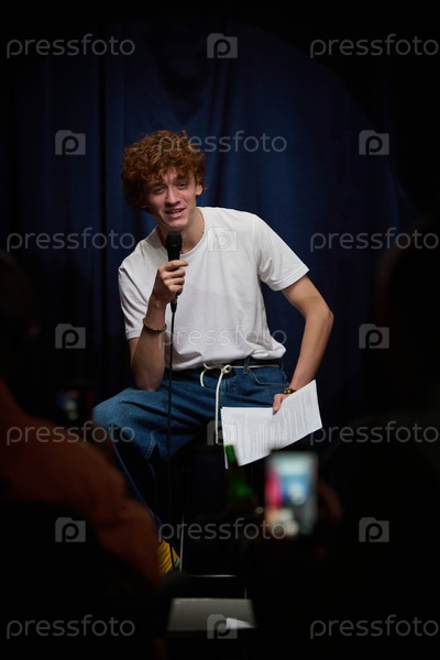 Улыбающийся рыжеволосый мужчина держит микрофон на сцене