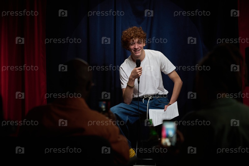 Улыбающийся комик выступает в комедийном клубе