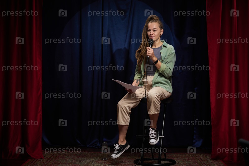 Молодая женщина, выполняющая стандартную комедию на сцене