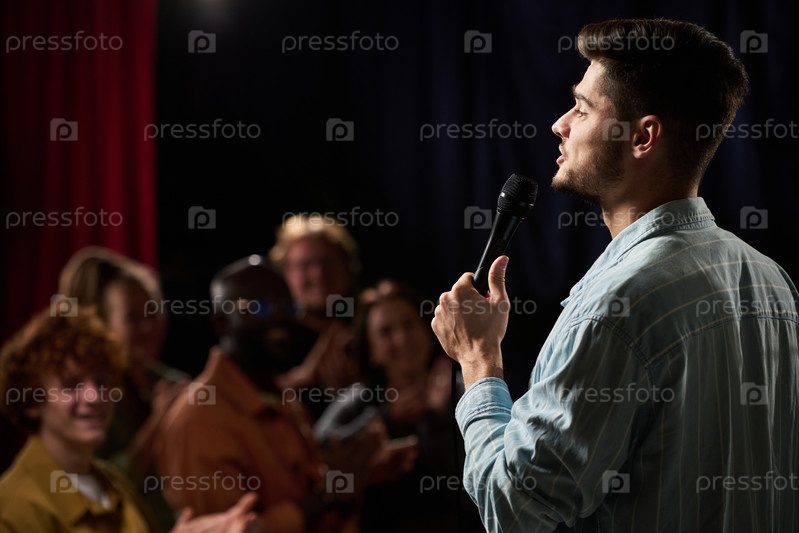 Мужчина поет на сцене перед аудиторией с микрофоном