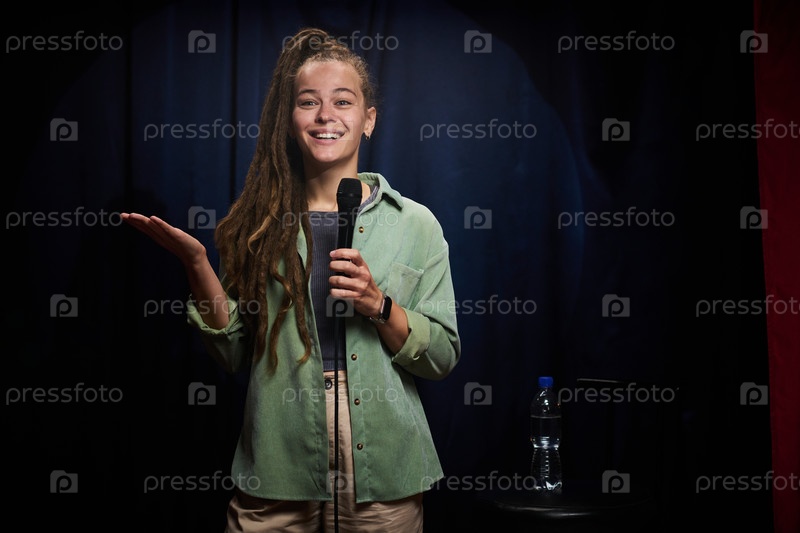 Улыбающаяся женщина исполняет стенд-ап комедию на сцене