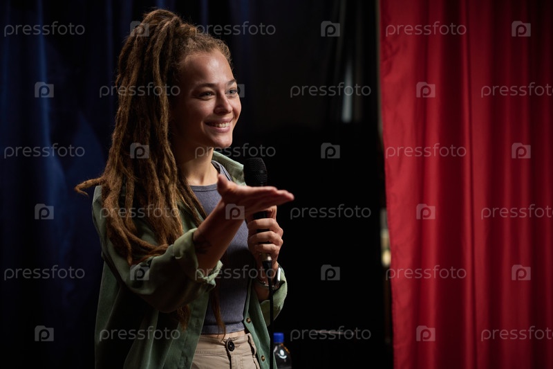 Улыбающаяся молодая женщина дает презентацию на сцене