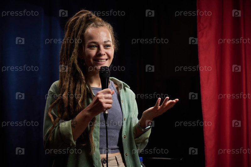 Улыбающаяся женщина с дредольками, исполняющая стенд-ап комедию