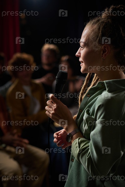 Женщина, исполняющая стенд-ап комедию на сцене в клубе