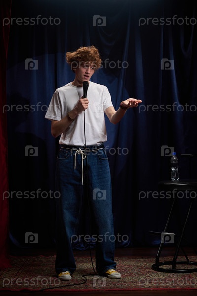 Выступая на сцене в стиле стендап-комедии в синих джинсах