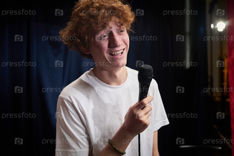 Смех исполнителя, держащего микрофон на сцене