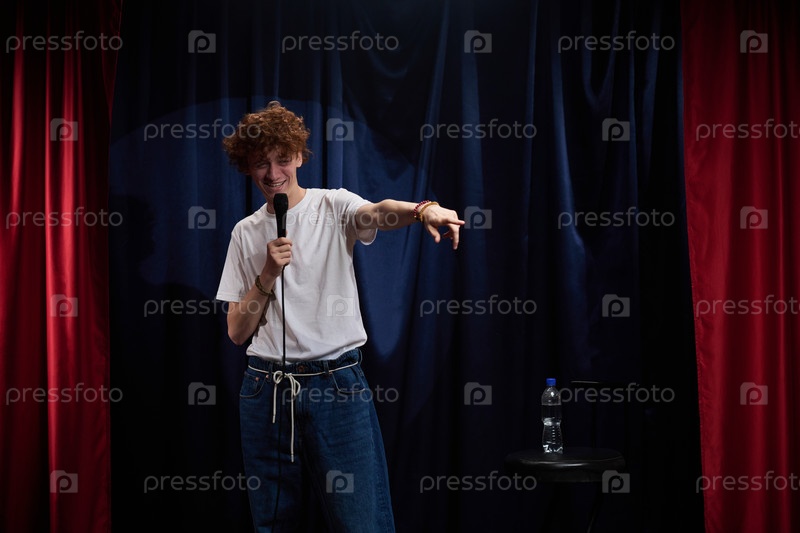 Исполнение стенд-ап комедии с микрофоном на темной сцене