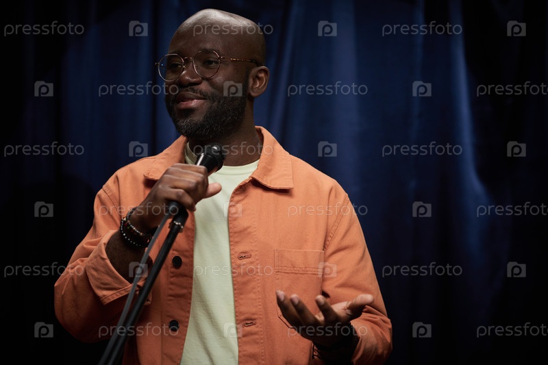 Улыбающийся исполнитель держит микрофон на сцене