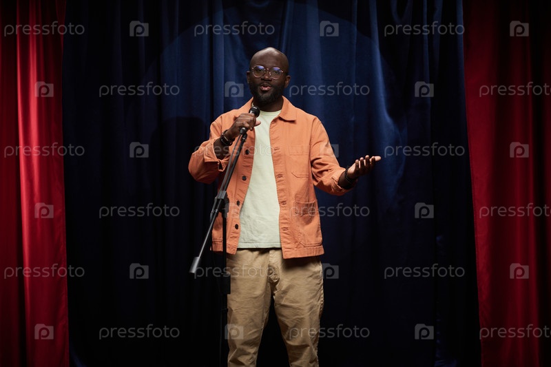 Выполнение стенд-ап комедии на сцене, держащей микрофон