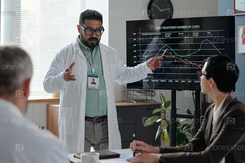 Ближневосточный доктор дает презентацию, указывая на данные на конференции