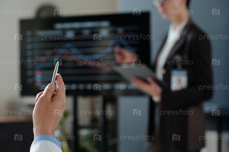 Доктор поднимает руку, задавая вопрос на медицинской конференции