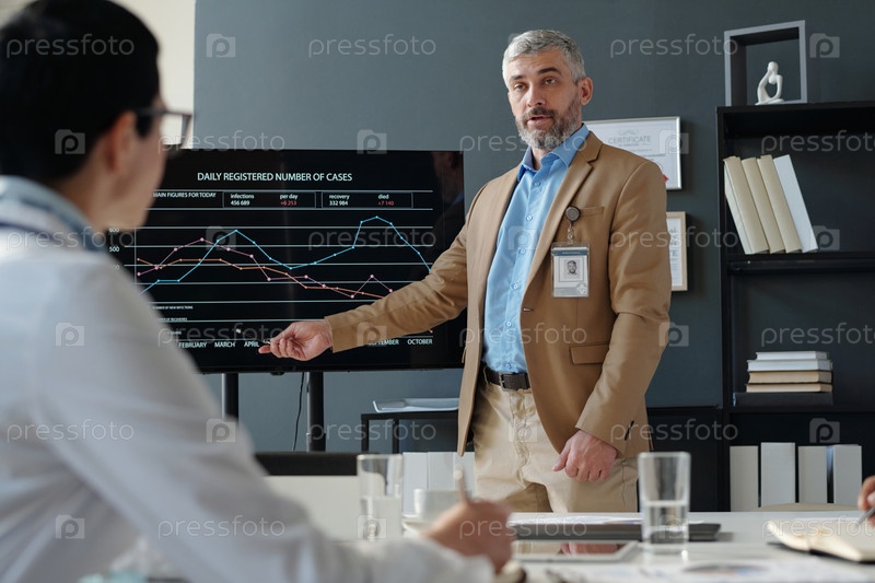 Бизнесмен выступает на конференции, указывая на график данных