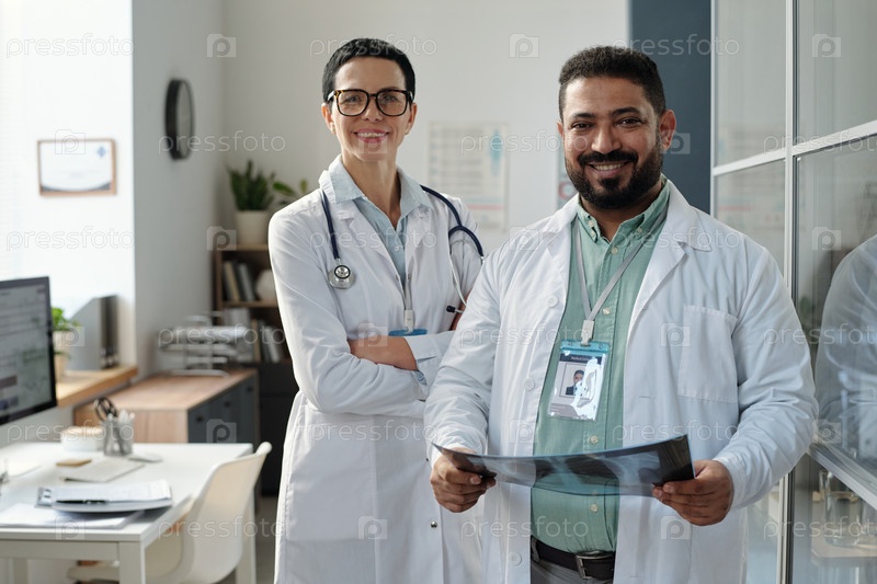 Два улыбающихся медицинских работника, одетых в лабораторные пальто